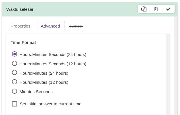 This is our project name: https://five.epicollect.net/project/ipb-ubs-kuantitatif-d. The time entry question is the third from the back. Thank you