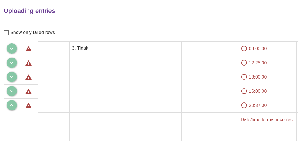 This month Iâm back to it not uploading due to time format issues once more. A time like 10:30:00 is not accepted. Error: âDate/time format incorrectâ. Iâve tried forcing removal of any fancy spreadsheet formatting by saving it from notepad, but no joy. (My spreadsheet program on this machine is Libre Calc).