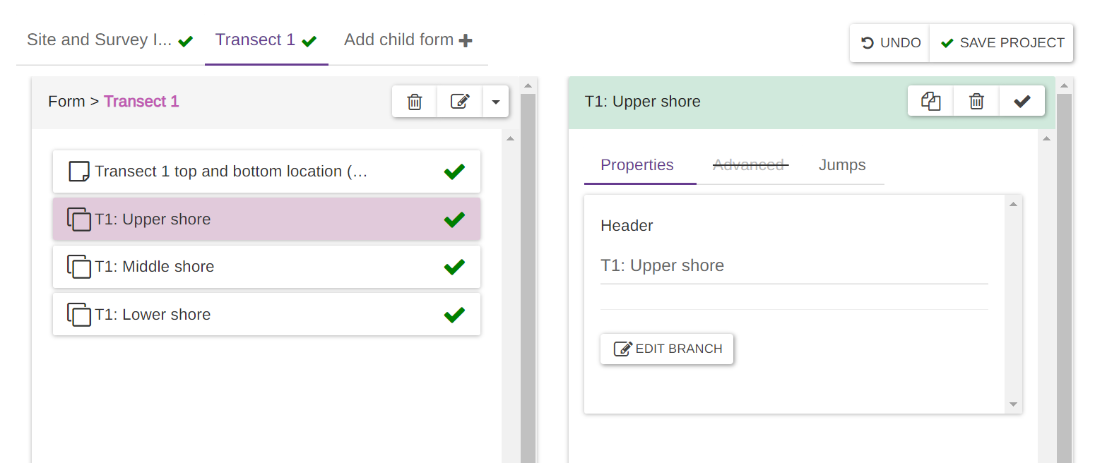 The project is called ’ CLMBMP ROCKY SHORE QUADRAT V2’. My intention is to have one main form that leads to three child forms for three transects. Within each child form I have created three branch questions (shore zone), and within each branch, 4 groups (quadrats), that contain three questions.