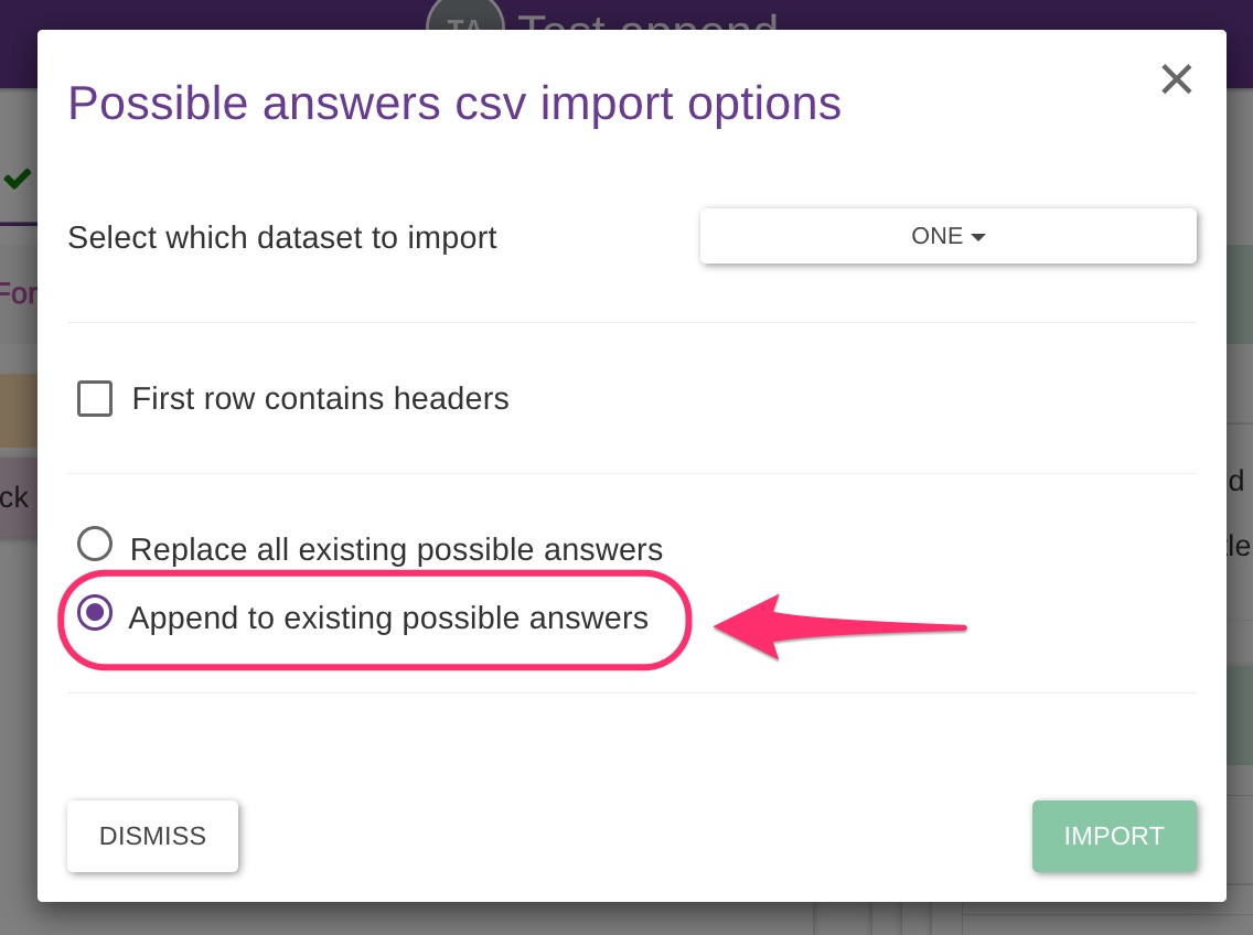 To correctly add possible answers to an existing list, and therefore preserve existing responses, Epicollect5 provides the option to APPEND possible answers to an existing list when importing the possible answers from a csv file.