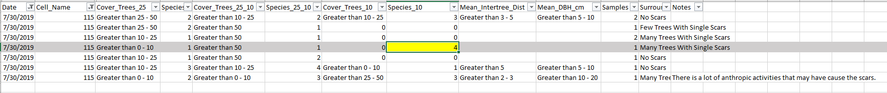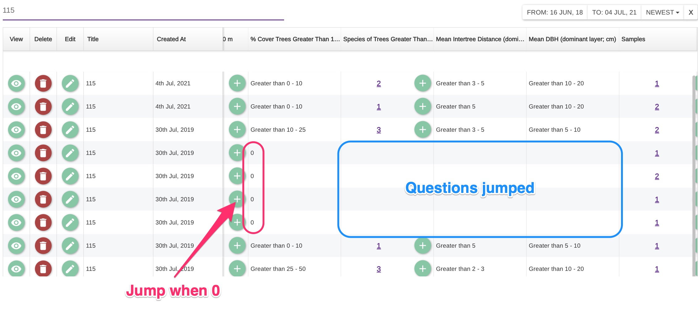 In your question “% Cover Trees Greater Than 10 m,” there’s a jump set to skip the branch question “Species of Trees Greater Than 10 m” if the answer is 0, directing the flow directly to “Samples.” As a result, the dataviewer correctly ignores all cells between “% Cover Trees Greater Than 10 m” and “Samples” when the answer is 0, as expected.