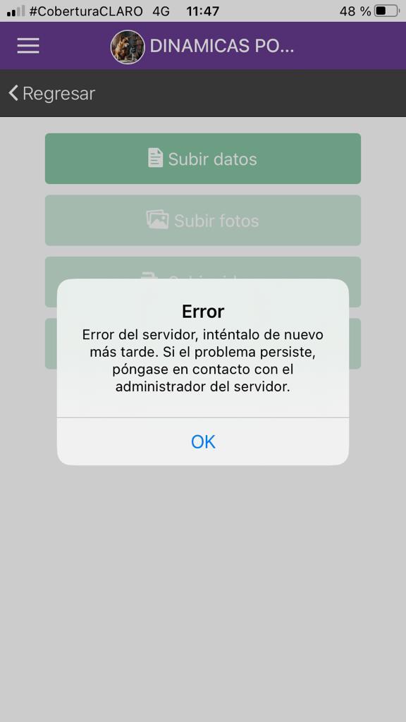 Hemos recurrido a subir los datos desde WiFi, revisar la configuración del proyecto, ampliar la capacidad de almacenamiento de los celulares, cambiar de dispositivo (Android (Samsung, tableta Lenovo) o Iphone) pero sigue apareciendo el mismo error (adjunto imagen).