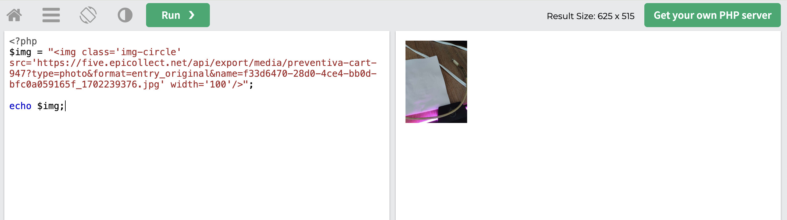 $img = "<img class='img-circle' src='https://five.epicollect.net/api/export/media/preventiva-cart-947?type=photo&format=entry_original&name=f33d6470-28d0-4ce4-bb0d-bfc0a059165f_1702239376.jpg' width='100'/>";